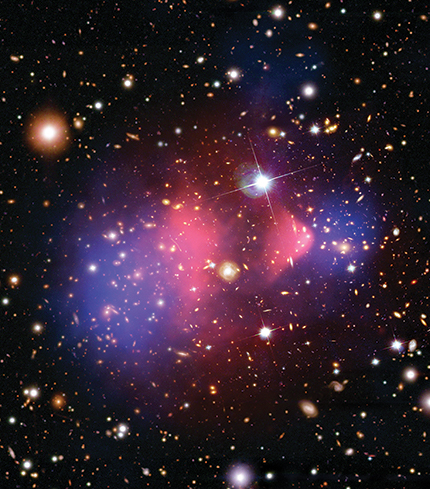 The Bullet Cluster. X rays (pink) illuminate what remains of the intracluster mediums (ICMs) after a two-cluster collision. The clump on the right—one of the cluster’s original, dense ICM cores—now generates a pressure-matched, bow-shaped feature in the surrounding ICM. The small cross sections of the galaxies (white) and dark matter (blue) allowed them to pass through each other with no interaction. (X ray: NASA/CXC/M. Markevitch et al. Optical: NASA/STScI; Magellan/U. Arizona/D. Clowe et al. Lensing map: NASA/STScI; ESO WFI; Magellan/U. Arizona/D. Clowe et al.)