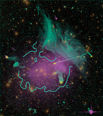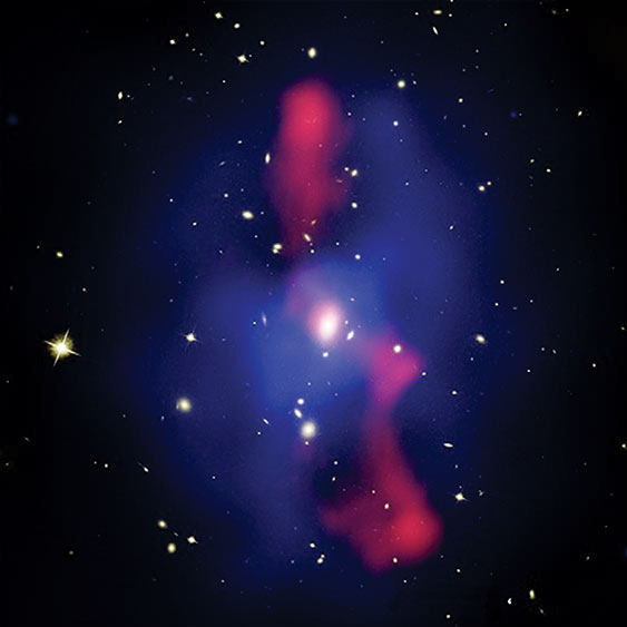 The MS 0735.6+7421 cluster. The cluster’s inner 700 000 parsecs contain stars and galaxies observed at near-IR wavelengths around 800 nm (white) surrounded by the intracluster medium (ICM; blue), a thermal plasma seen in x-ray emission. The synchrotron emission (red) highlights the radio plasma that excavated cavities in the thermal ICM. (Adapted from ref.