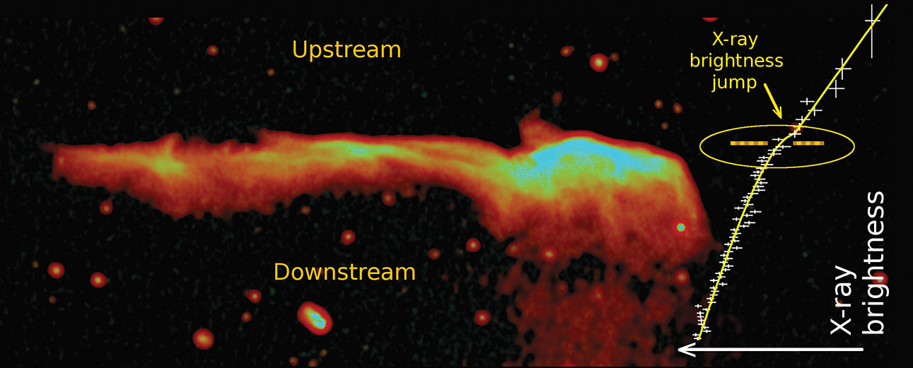 Radio emission from the Toothbrush cluster illuminates an upward-moving shock at the northern edge of its parent cluster. A profile of the x-ray emission along a vertical line through the brightest radio region from the downstream (postshock) to upstream (preshock) material is shown sideways on the right. A brightness discontinuity, the x-ray signature of a shock, can be seen at the same location as the radio emission feature. (Adapted from ref.