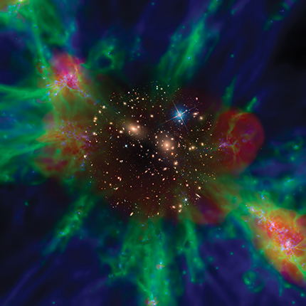 But for the infalling baryons still in a diffuse state, a quite different fate is in store. The high kinetic energy from their gravitational infall is converted into thermal energy in the outskirts of the cluster, which slows the infalling material’s velocity. That conversion happens at the so-called accretion shock, which causes a jump in density and temperature. Those shocks have been seen in computer simulations but not yet in observations. After conversion of its kinetic energy, the plasma—part of the ICM now—reaches a temperature of about 108 K, hot enough for astronomers to detect its radiation in x rays. As the stars in the cluster galaxies continue to age, winds and shocks transport stellar-processed material into the ICM, enriching it with elements, from carbon to iron, produced inside stars.