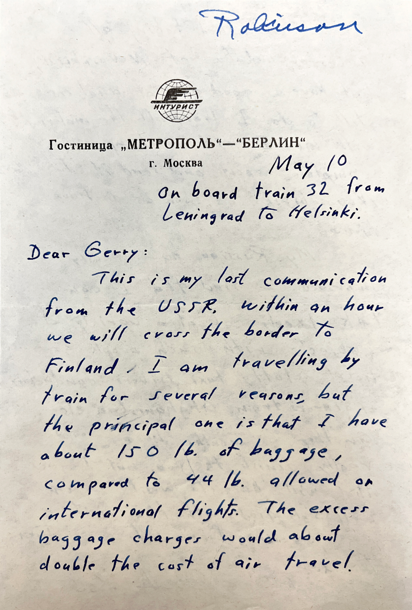The first page of a handwritten letter sent in 1968 by Clark Robinson, who was on his way back to the US from the USSR, to Gerald M. Almy, the head of the physics department at the University of Illinois Urbana-Champaign. A nuclear physicist at the university, Robinson spent seven months in Novosibirsk working on R&D for electron accelerators. (Photo courtesy of the University of Illinois Urbana-Champaign department of physics.)