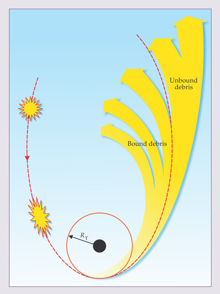 Figure 1. A star that comes within the tidal-disruption radius RT of the supermassive black hole at the heart of a galaxy will be torn apart by the black hole’s gravity. Roughly half of the gaseous stellar debris remains gravitationally bound in a range of highly eccentric elliptical orbits that typically bring it back over a course of months to years to be consumed by the black hole. Viscously heated as it’s finally funneled down toward the black hole’s event horizon (the black dot’s edge), the gas radiates a telltale flare that fades as the feeding subsides. The rest of the debris escapes the black hole’s gravity in an expanding high-velocity tail. (Adapted from ref.