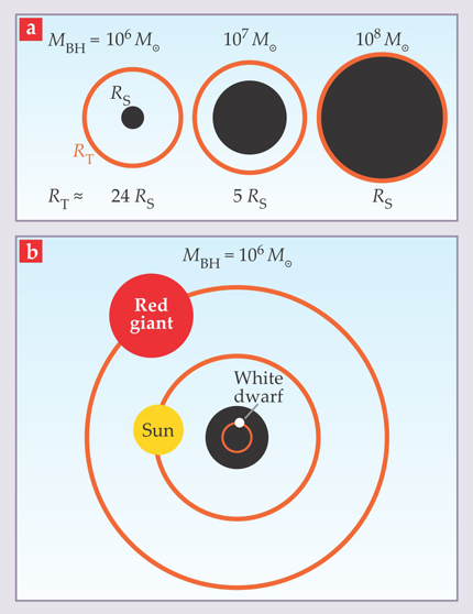 Figure 2. The tidal-disruption radiusRT depends on the mass MBH of the black hole doing the disrupting and on the properties of the star being disrupted. (Nothing here is shown to scale.) (a)RT (orange circles) grows like (MBH)1/3. But the black hole’s Schwarzschild radius RS (black-disk boundaries) grows like MBH. For the Sun-like star of this illustration, RS and RT become equal at MBH ≈ 108 M⊙. So the tidal disruption of a Sun-like star by a (nonspinning) black hole heavier than 108 M⊙ couldn’t be seen. (b) For a given black hole mass, RT depends sensitively on stellar size. The stellar radii of red giants and white dwarfs are, respectively, a hundred times bigger and smaller than the Sun’s. Near a 106 M⊙ black hole like the one at the Milky Way’s center, a white dwarf would irretrievably disappear behind the central black hole’s RS before being torn apart.