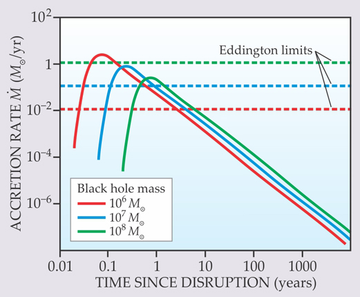 Figure 3. The accretion rate onto a supermassive black hole (SMBH) of debris from a star’s disruption by that SMBH is plotted for different black hole masses MBH as a function of time t. With increasing MBH, rise time to peak accretion increases, but the peak accretion rate decreases. For the lighter black holes, the peak accretion rate surpasses the Eddington limit, above which the accretion is likely to generate collimated jets of outflowing material and radiation. At late times, the accretion rates exhibit the t−5/3 decay expected for the range of eccentric Keplerian orbits of the gravitationally bound debris. (Adapted from ref.