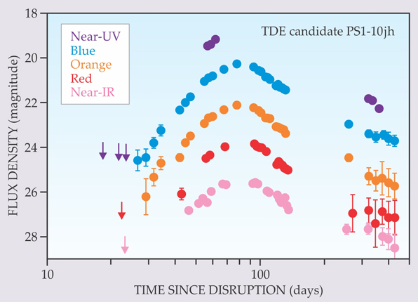 Our most promising TDE candidate, PS1-10jh, was discovered in 2010 by coordinated monitoring of a patch of sky every two or three days with NASA’s GALEX UV telescope and the Pan-STARRS1 optical survey telescope in Hawaii. 8 We detected a flare from the nucleus of a normally inactive galaxy about 3 million light-years away. Our frequent sampling of the celestial patch let us catch PS1-10jh on its rise to peak luminosity (see figure 4).