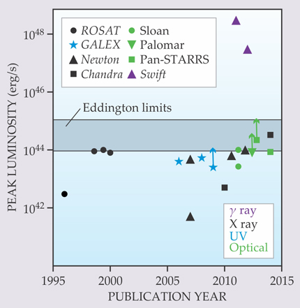 Figure 5. The peak luminosities of the 20 candidate tidal-disruption events (TDEs) discovered to date by ground-based and orbiting telescopes. Arrows indicate upper limits. The shaded region shows the range of Eddington upper limits on luminosity for black holes with masses ranging from 106 to 107 solar masses. Only the two TDE candidates discovered in hard-x-ray flares by the Swift orbiter peak well above the Eddington limits, suggesting highly beamed radiation in our direction from jets of stellar debris boosted to relativistic velocities.