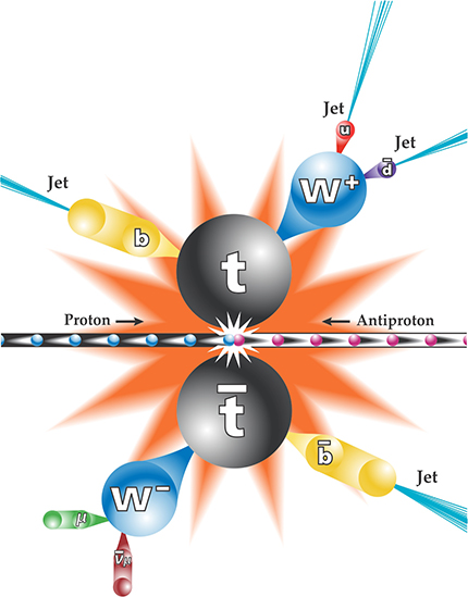 Figure 1. A top–antitop quark pair can be produced from the collision of energetic protons and antiprotons. A quark from the proton annihilates an antiquark from the antiproton, and according to the celebrated E = mc2 formula, the energy E released by the annihilation can be converted into the mass m of new particles. The top quark (t) decays into a W boson and a bottom quark (b), and the antitop quark (t) decays into the corresponding antiparticles. The W boson could decay into a pair of quarks that form jets, as described in the text, or it could decay into a charged lepton and a neutrino. In the process illustrated here, the top quark’s final decay products are two jets associated with quarks arising from W boson decay and a single jet from a bottom quark; the antitop quark yields a muon, a neutrino, and a jet from a bottom quark. Note that the jets associated with bottom quarks contain particles that are displaced by a few millimeters from the location at which the bottom quark is created. (Courtesy of Fermilab.)