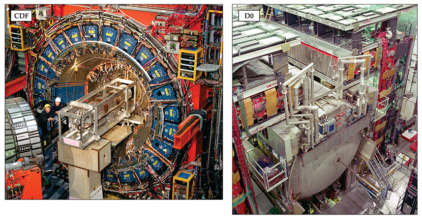Figure 2. Large, complex detectors are needed to spot the products of top-quark decays. These detectors—the Collider Detector at Fermilab (CDF) on the left and the D0 on the right—weigh thousands of tons and contain millions of channels sensitive to tens of millions of interactions per second. The enormous amount of data coming from such detectors required the most modern computing and analysis tools and significant people power, too: Hundreds of scientists worldwide analyzed CDF and D0 data to come up with new discoveries and precision measurements of such elementary-particle parameters as the mass of the top quark. Some 26 countries are represented by the scientists who designed and operated these detectors or analyzed their data. (Courtesy of Fermilab.)
