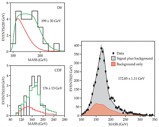 In their paper, the CDF researchers concluded that the odds were only one in a million that background fluctuations could account for the events attributed to the production and decay of top quarks; the D0 collaboration, in its paper, put the odds at two in a million. The top-quark masses reported by the two experiments were 176 ± 13 GeV for the CDF and 199 ± 30 GeV for the D0. Figure 3 shows the data from which those determinations were made and also includes more recent results from the 2001–11 Tevatron run.