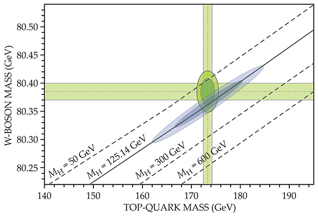 Figure 4. The masses of the top quark, W boson, and Higgs boson are related by the standard model. In this plot, the diagonal gray lines indicate the predicted value of the Higgs mass, given those of the W boson and top quark and various electroweak parameters. The horizontal and vertical bands indicate the 1-σ confidence regions of the measured W-boson and top-quark masses; the oval green contours cover 1-σ and 2-σ confidence areas for the joint W-boson and top-quark masses. The blue contours are 1-σ and 2-σ confidence areas for the W-boson and top-quark masses as predicted from electroweak parameters and the measured mass of the Higgs boson. The remarkable agreement between the experimental measurements and the predictions indicates a profound self-consistency of the standard model. (Adapted from an image courtesy of the Gfitter group, http://project-gfitter.web.cern.ch/project-gfitter.)