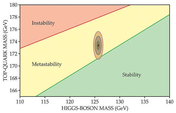 Figure 6. The universe is metastable, long-lived but not eternal, for certain combinations of top-quark and Higgs-boson masses. Given the current determination of the top-quark mass, the Higgs-boson mass of about 125 GeV is close to the boundary for stability, but a definitive answer will require a much more precise measurement of the top-quark mass. The three ellipses represent 1-σ, 2-σ, and 3-σ confidence areas for the mass determinations. (Adapted from ref. 10, which uses a somewhat different Higgs-boson mass than we cited in the main text.)