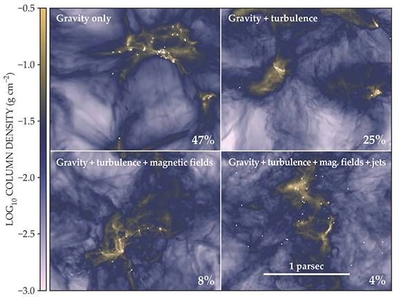 Explaining star formation’s inefficiency requires invoking physical processes beyond gravitational collapse. The four panels show numerical simulations of star formation