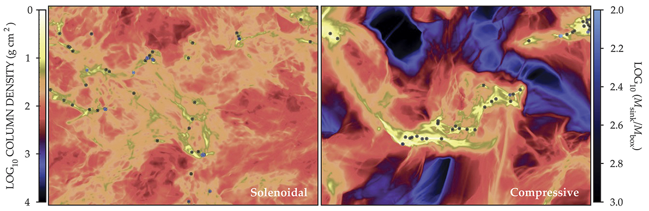 Whether the turbulence mode is solenoidal or compressive determines which parts of a cloud reach densities high enough to form stars. The mode also determines how efficiently the stars form. In these two simulations