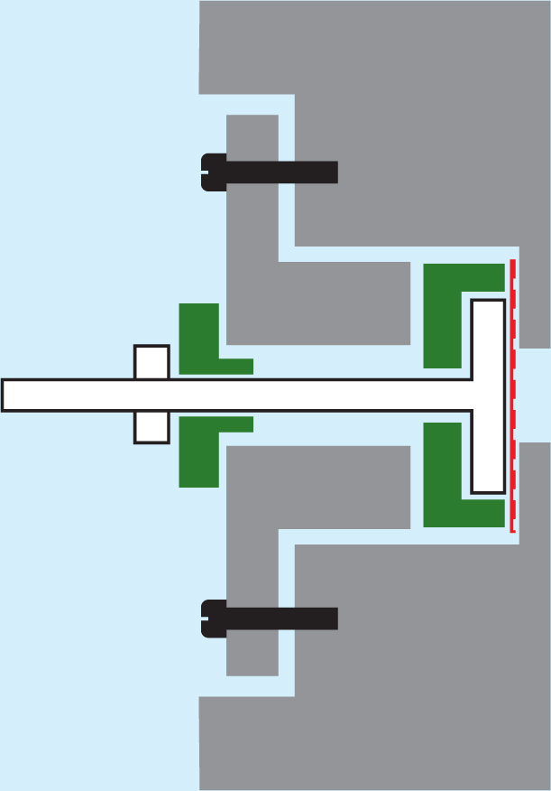 Figure 4. Modern superleak transducer for second sound. Nuclepore is a plastic film with micron-size holes created by fission fragments in a reactor. Here a thin film of nuclepore (red) is plated with gold on one side to make a capacitor “loudspeaker.” The frame (gray) is connected to a bias voltage and connected to ground by a large capacitor, the rod and button (white) are insulated electrically (green) and connected to an oscillator, and the whole apparatus is immersed in a bath of helium II. The oscillator causes the nuclepore to vibrate, typically at 20-50 kHz. The normal fluid cannot pass through the film’s holes, but the superfluid can, and the transducer can act as a generator or detector for second sound.