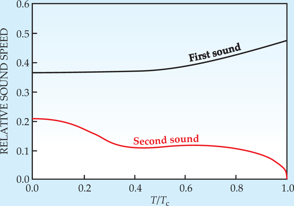First sound is ordinary sound, which consists of fluctuations in total density ρ. Its velocity, u1, is only weakly dependent on temperature. Second sound has a velocity u2 that is a strong function of temperature, becoming zero at the lambda point. As shown in box 1, second sound consists of fluctuations in entropy or temperature.