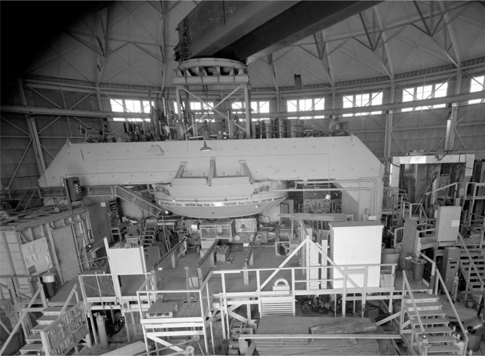 The large circular building that housed the giant magnet was ideal for our purposes. Around its wall on the inside were numerous shops and batches of heavy electrical equipment. An upper level included offices and conference rooms. In the center was the big magnet with a hastily erected platform at the level of the lower pole-piece surface. Two large vacuum-chamber tanks with slightly over 2 feet of inside clearance in the magnetic-field direction were stacked in the 72-inch gap. They had access faces on opposite sides for mounting ion sources and collectors. Control rooms for each tank were nearby at platform level.