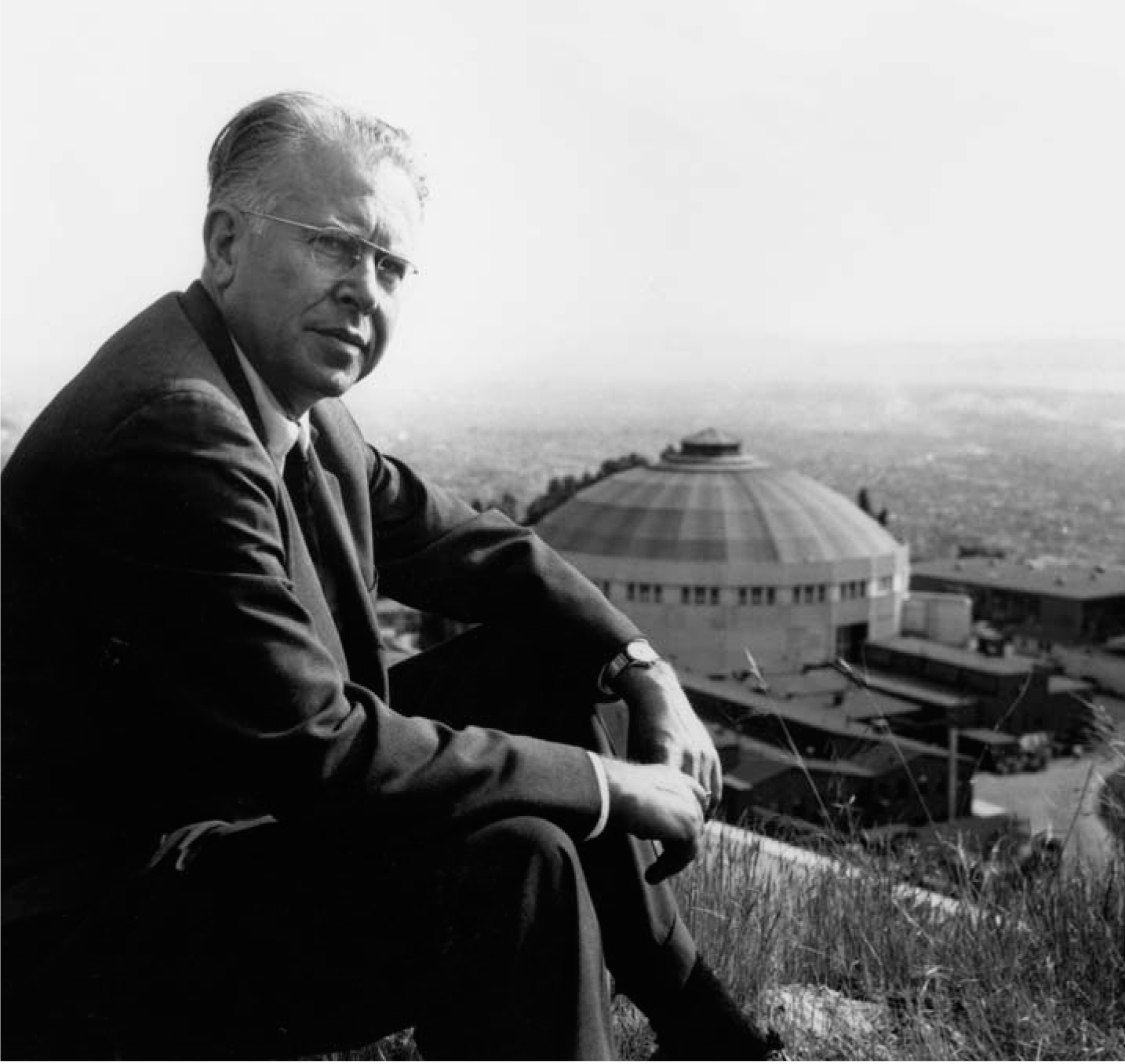 Figure 3. Ernest Lawrence as he poses on the big hill behind the University of California, Berkeley, campus. The 184-inch magnet, housed in the building visible in the background, became operational in June 1942, about the time this picture was taken.