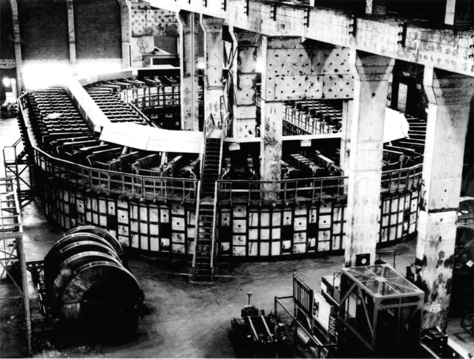 Figure 5. This Alpha-I racetrack was part of the Y-12 plant in Oak Ridge, Tennessee. In it, process tanks with calutron units alternate with magnetic windings made of silver. Electrical-equipment cubicles with control panels are in a separate bay. Vacuum pumps are on a lower level.