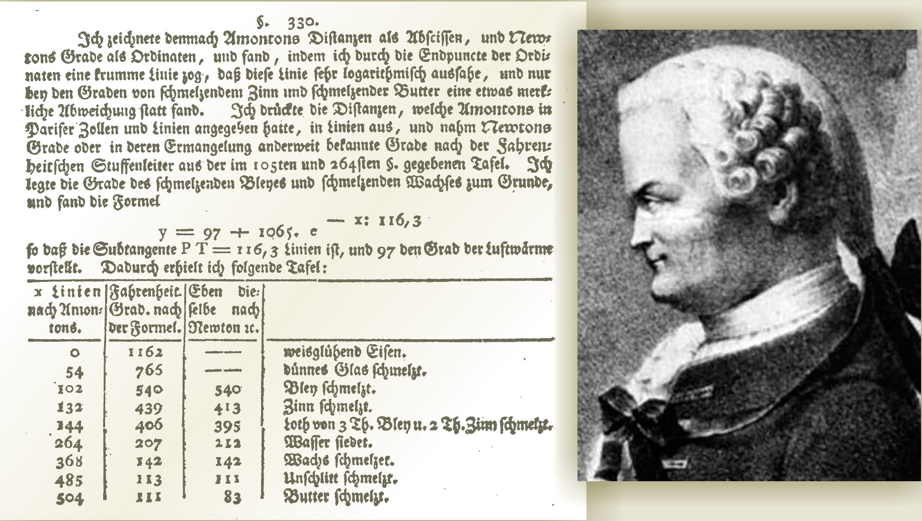 Figure 1. Johann Heinrich Lambert, a versatile scientist and philosopher, introduced the heat-conservation framework for analyzing heat conduction in a rod heated at one end and allowed to dissipate energy to the atmosphere. He showed that the temperature y and distance x in his experimental data satisfied an exponential relation, y = 97 +1065 · exp(−x/116.3). The left column in the table gives the distance, with units unspecified. The next two columns give the temperature in the Fahrenheit and Newton scales, respectively, based on the melting or boiling of various substances (column 4). From top to bottom, the materials tested by Lambert are specified as white-hot iron, thin glass, lead, tin, lead-tin alloy, boiling water, wax, melting tallow, and butter.