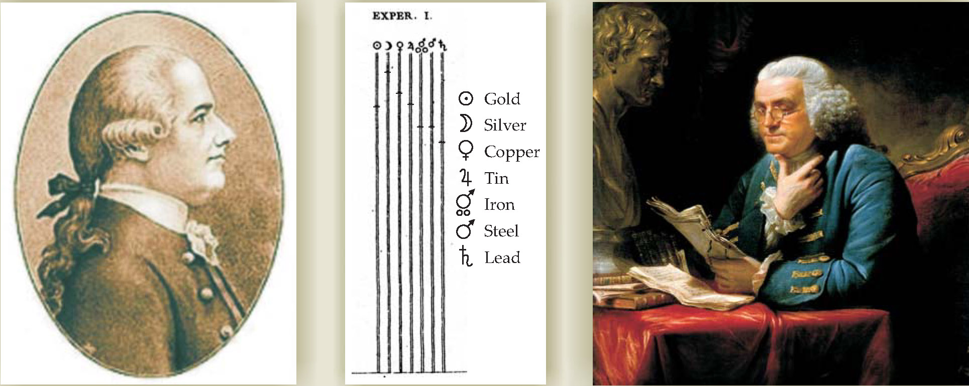 Figure 2. In a transatlantic collaboration, Jean Ingen-Housz (left) evaluated relative conductivities of different metals based on the experimental design and materials of Benjamin Franklin (right). The idea was to coat wires of various materials with wax and see how quickly the melt line propagated when one end of the wires was heated. The figure shows melt propagation distances from the bottom for seven materials at a fixed time. In a gracious acknowledgment, Ingen-Housz stated, “If these results bring light to the question we are trying to resolve, it is to this great man that physics will be indebted, not to me, who only followed exactly the project of Mr. Franklin.”