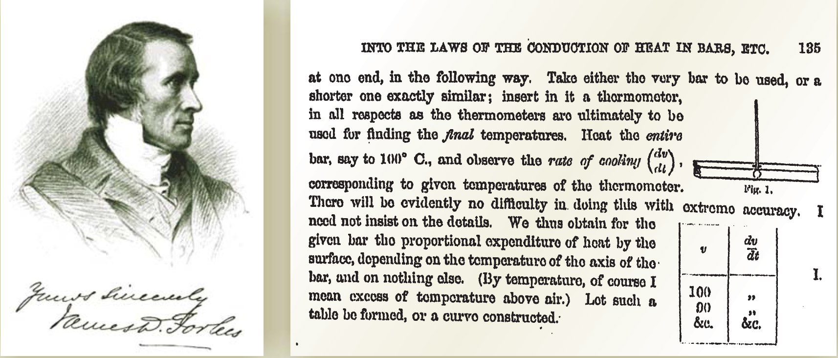 Figure 5. James Forbes was a meticulous 19th-century experimental physicist who made significant contributions to the science of heat. Forbes independently discovered essentially the same two-step approach that Joseph Fourier used to determine absolute conductivity, but instead of inverting experimental data mathematically as Fourier did, Forbes used a graphical technique and provided the first quantitative estimation of the temperature dependence of thermal conductivity. The illustration shows Forbes’s setup for measuring heat loss to the atmosphere as a function of temperature.