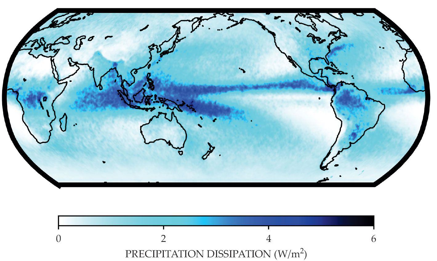 Falling precipitation. One of the most important sources of dissipation in the atmosphere occurs when raindrops fall, a process that reduces their gravitational potential energy. Using satellite information from NASA’s Global Precipitation Measurement mission, we estimated the dissipation for the years 2015–20 with the method outlined in reference