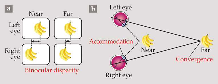 Figure 1. Physiological depth perception. Suppose you look at a bunch of bananas in front of you. (a) Each eye sees a different perspective, a physiological depth cue known as binocular disparity. The closer the bunch, the more pronounced the disparity. (b) Moreover, your eyes move such that their viewing directions converge at the center of the bananas. To image them, near or far, in focus with that convergence reflex, the thickness and curvature of the eyes’ lenses (gray) must also change. That process is referred to as accommodation.