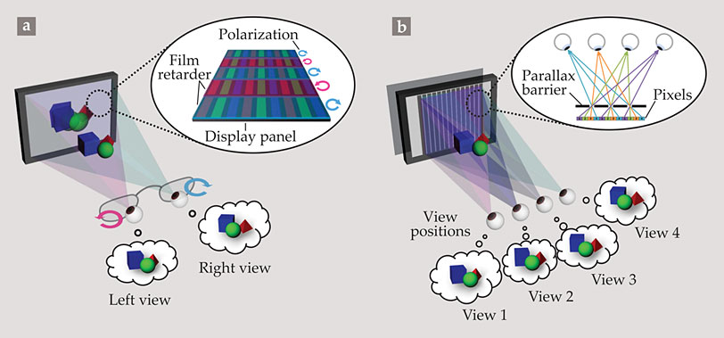 Figure 2. Stereoscopic and autostereoscopic displays.(a) Stereoscopic displays require viewers to wear special glasses to resolve a three-dimensional image from physiological cues embedded in two superimposed images on the screen. In this example, the glasses have lenses that are oppositely polarized, so that each eye sees only one polarization state, left-handed or right-handed, projected from alternate rows of wave retarders that polarize each pixel in one state or the other. Through such glasses each eye sees just half of the display’s vertical resolution. (b) Autostereoscopic displays require no glasses to separate images intended for left and right eyes. One approach is based on a parallax barrier—an alternating series of opaque and transparent strips that sit in front of a display panel. At different viewing positions, the observer’s eyes see different pixels in the display panel through the transparent strips and hence different perspectives.