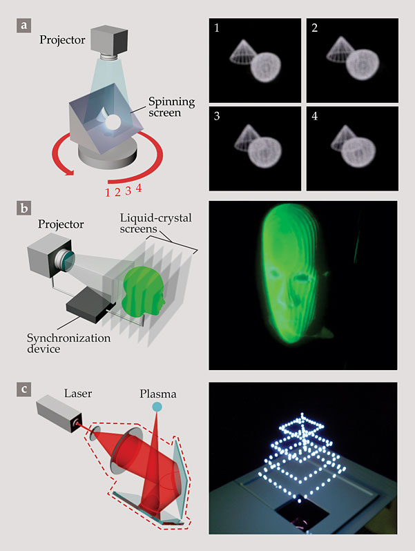 Other types of volumetric display don’t rely on a screen at all. One example is a color display whose images emerge from the frequency conversion of light in a nonlinear crystal. Visible light, for instance, is emitted at the intersection of two IR laser beams in rare-earth-doped heavy-metal fluoride glass. 13 By manipulating the crossed lasers, one manipulates the image. In another approach, a laser plasma display generates light emission in midair, 14 as shown in figure 3c.