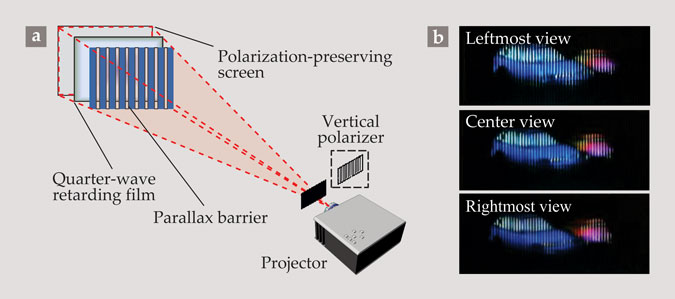 Figure 4. A frontal-projection three-dimensional display uses a parallax barrier made of a polarizing film that blocks horizontally polarized light. (a) A projected image is first vertically polarized so that it can pass through the barrier film. While reflecting back onto the barrier from a polarization-preserving screen, the light passes twice through a quarter-wave retarding film that rotates the image’s polarization horizontal. As a result, viewers only perceive light reflected from the screen through open slits, just as they would in an ordinary parallax barrier whose images are projected from a display behind it. (b) A frontal projection of two cars viewed from different perspectives.