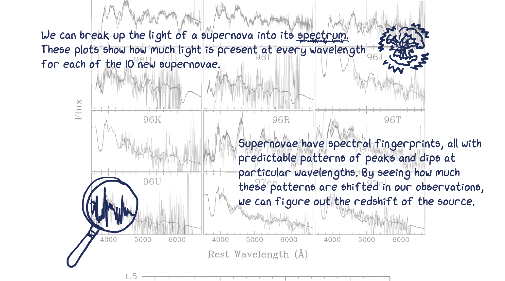 Data tables and figures are ideal places to explain the background science that underlies the research. In this example, annotations overlaying the spectra of several supernovae explain spectroscopy and how it is used to measure the redshift of cosmic objects.