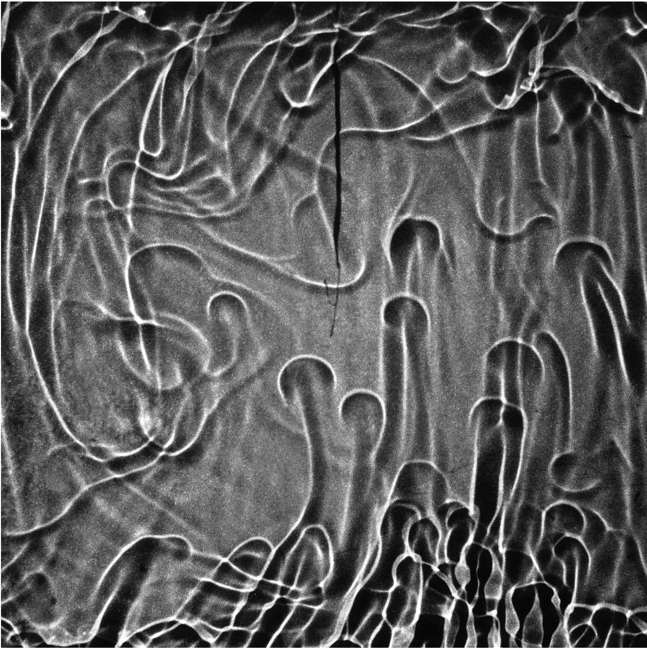 Figure 1. Turbulent motion of glycerol in a container heated from below and cooled from above. The bright lines show regions of rapid temperature variation. The fluid contains many “plumes,” especially near the walls. The plumes can be identified as mushroom-shaped objects with heat flowing through the “stalk” and spreading in the “cap.” The hot plumes tend to rise with their caps on top; falling, cold plumes are cap-down. All this plume activity is carried along in an overall counterclockwise “wind.” Note the thermometer coming down from the top of the cell.
