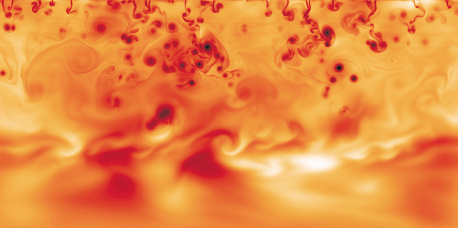 Figure 3. Computer-simulated temperature pattern near the surface of the Sun. The surface is at the top of the picture. The darker colors indicate lower temperatures. Notice the many falling plumes near the surface. The simulation is by Andrea Malagoli, Anshu Dubey, and Fausto Cattaneo, all at the University of Chicago.