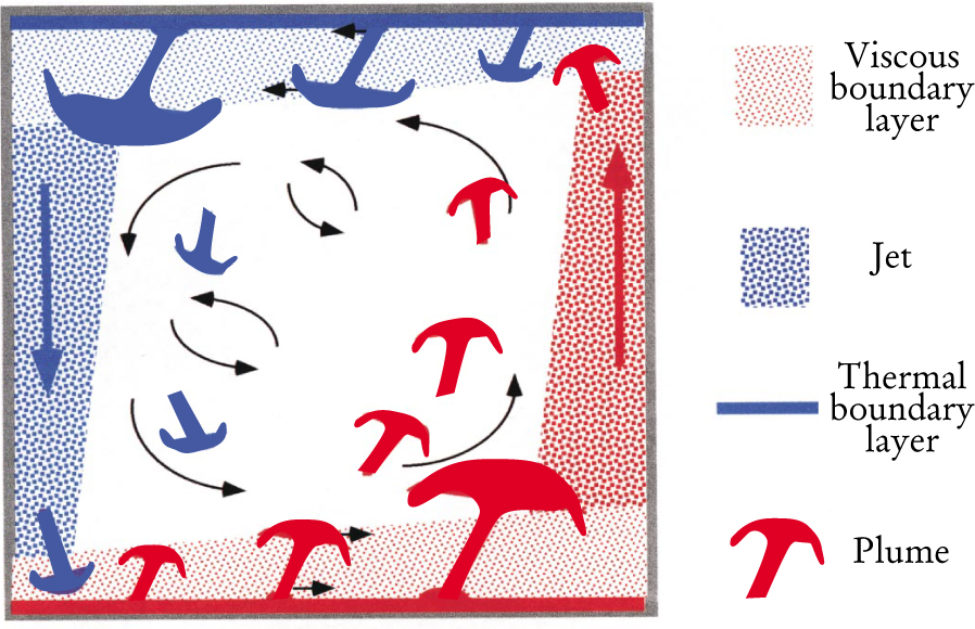 So, the heat flow has created a “machine” containing many different working parts: boundary layers, mixing zones, jets, and a central region. Figure 4 is a cartoon of the machinery at work. To follow the process, start at the lower left-hand corner of the convective cell. A wind produces flow from left to right, carrying with it some waves. Here, the waves are bulges in the height of the thin boundary layer at the bottom of the cell. As they move, the waves throw up a hot spray that tends to rise, forming sheets of hot, upward motion. These sheets break up into columnar structures that form the plumes shown in figures 1 and 4.