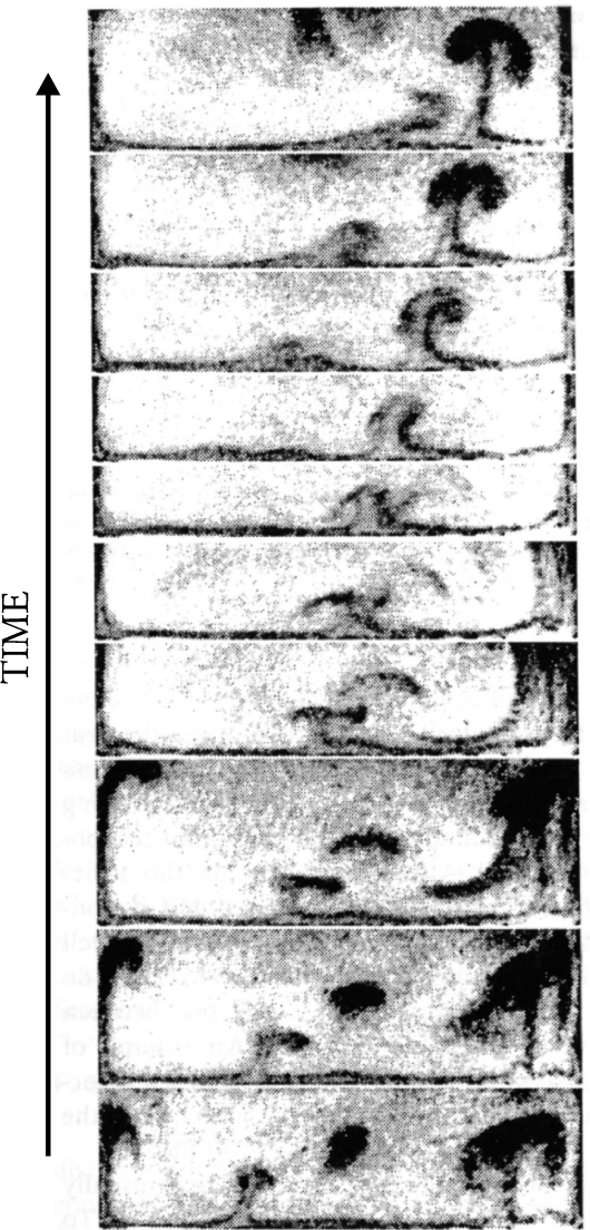 Figure 5. Plumes move across a bottom boundary layer and hit a side wall. Time goes upward in this series of experimental visualizations. Here, there is an overall left-to-right “wind” along the bottom of the tank. Notice how the plumes form on top of the waves, ride with the wind, and are squeezed into the side wall.