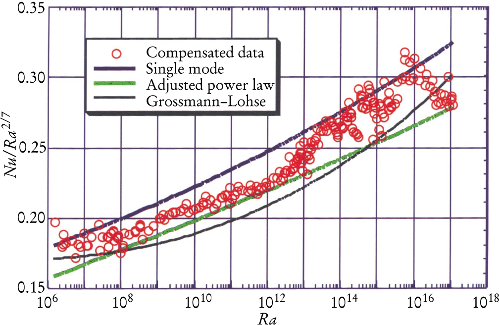Figure 7. Ra–Nu relations. The graph shows the dimensionless heat flow Nu plotted against the dimensionless temperature difference Ra. In each case, the Nu values are compensated by being divided by (Ra)2/7. The experimental data are shown by red circles and are derived from Niemela et al., ref. 6. The power law has β = 0.309 as suggested by Niemela et al. The other two curves depict theoretical heat-flow calculations and are of the forms indicated in equations 3b and 3c. In each case, the fitting curves have been rigidly displaced from their best (least squares) positions to better show the data. Not one of the theoretical calculations makes use of the plumes so evident in several of the previous figures. This lack suggests that we do not yet fully understand what we are seeing in the Rayleigh–Bénard system.