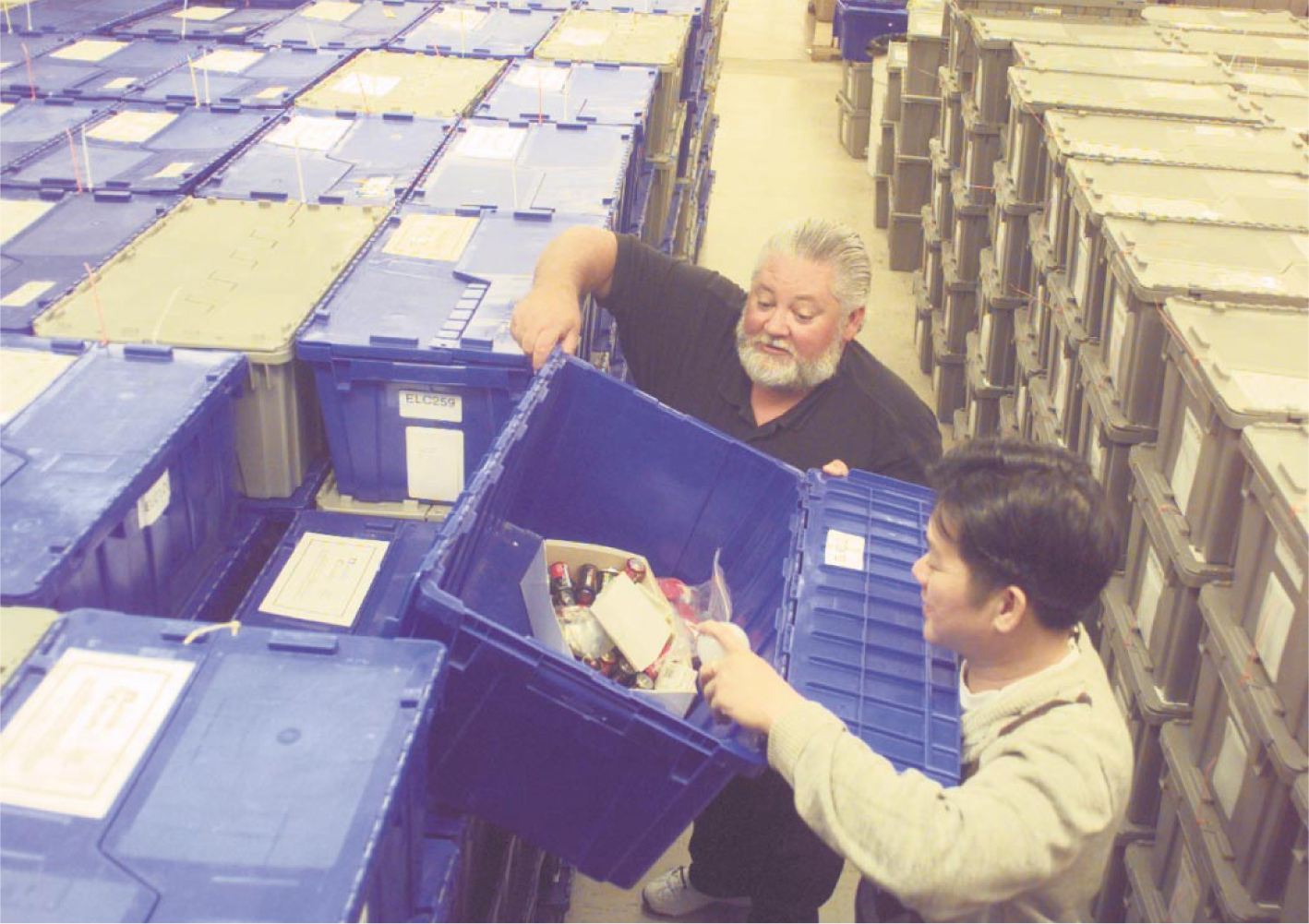 Figure 4. Packed with science activity materials, these boxes are some of the 3000 kits bound for the 127 elementary schools in Montgomery County, Maryland. After 8-10 weeks, the kits are collected by the Taylor Science Materials Center, where they are refurbished and then promptly sent out again. In a school year, each classroom teacher receives three such kits, which, together with supplementary hands-on activities, constitute the entire science program. Shown in the photo are Tom DuMars, the center’s nationally renowned director, and an unidentified staff member.