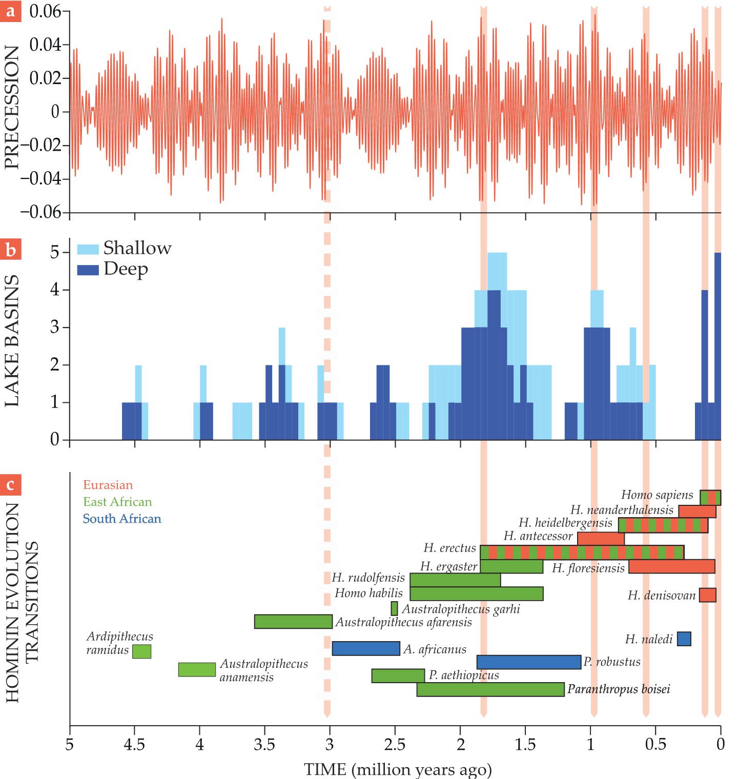 Human evolution is connected to African climate change. Large variations in the precession of Earth’s orbit (a) help determine the size and number of deep freshwater lakes in the East African Rift Valley (b). Those lakes, in turn, can be linked to major evolutionary changes in early humans (c). The red dotted line marks the first dispersal of hominins throughout Africa; solid red lines identify the times when hominins dispersed from Africa to Europe and Asia. (Adapted from ref. 8.)