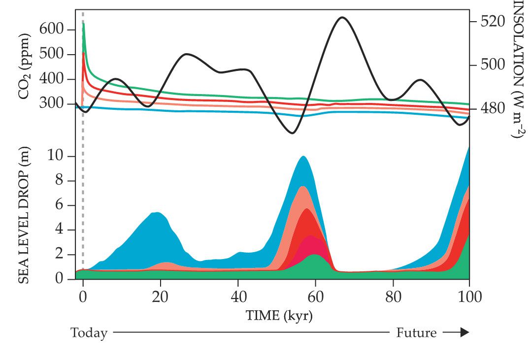 Future ice ages depend on orbital forcing and on the quantity of greenhouse gases humans will emit (colored lines) during the next 100 years. The four corresponding emission scenarios graphed here from climate model simulations—green illustrates the highest emissions, followed by red, orange, and blue—show that anthropogenic climate change dwarfs the effect of orbital forcing and could delay the next ice age for 60 000 years. (Adapted from ref. 15.)