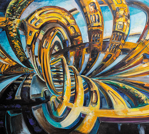 This painting by Lukos Hey imagines a disused railway station in Prague’s Vyšehrad district projected onto a Hopf fibration, a topological function that describes a 3-sphere (a 4D version of a sphere) in terms of a 3D sphere and a set of circles. (©Lukos Hey, http://lukoshey4.webnode.com