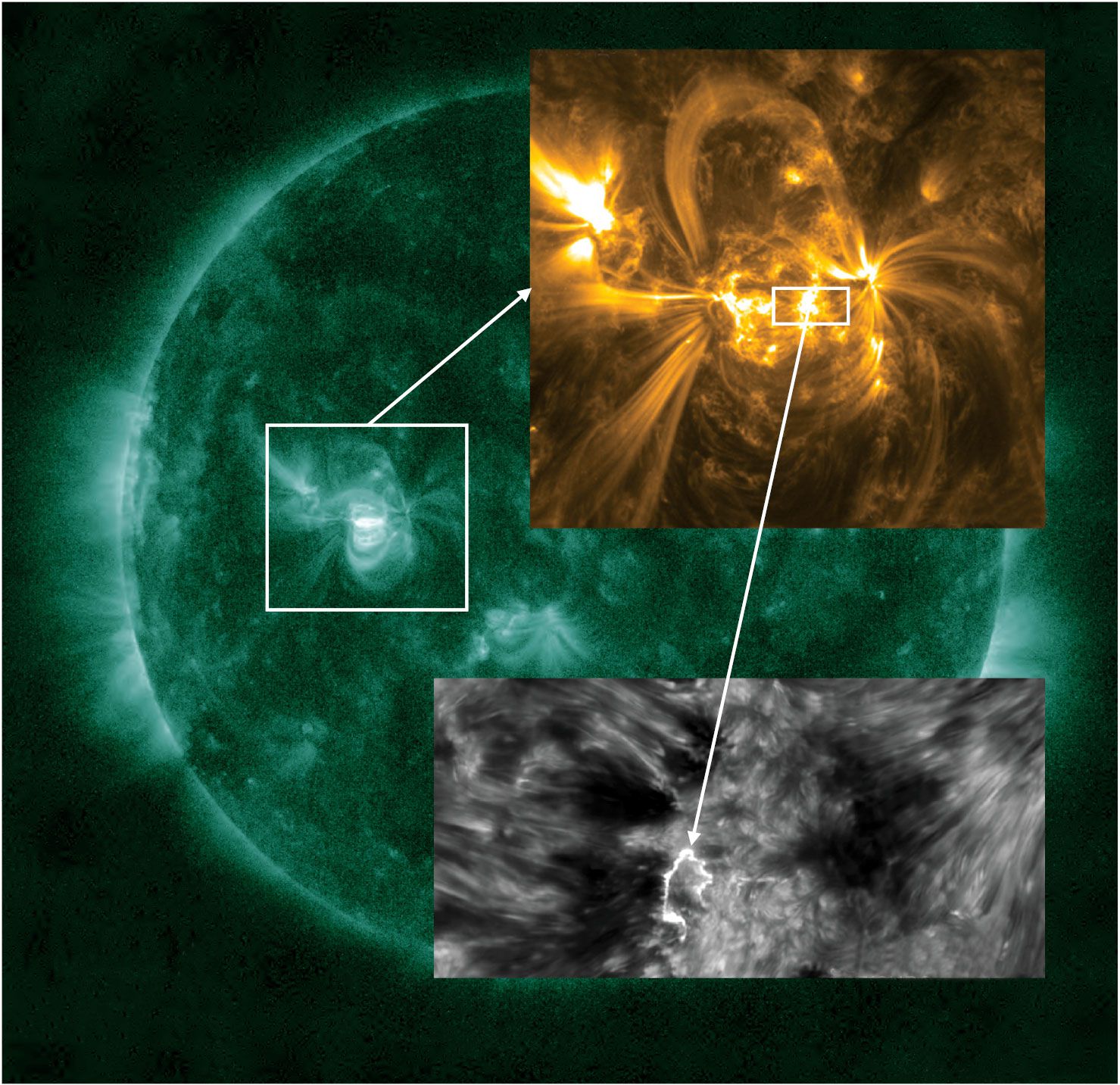 A microflare that occurred on 4 September 2016. In the green image, recorded at 94 Å, a hot coronal loop of more than 7 × 106 K is produced by magnetic reconnection. The upper inset, recorded at 171 Å, shows the active region with bright magnetic loops in high detail, and the lower inset, recorded at 3934 Å, depicts the region where electrons from the reconnection event impact the Sun’s lower atmosphere. (Adapted from a composite image by Helle Bakke/Rosseland Centre for Solar Physics/University of Oslo, courtesy of the European Solar Telescope; background and upper inset courtesy of NASA/Solar Dynamics Observatory/Atmospheric Imaging Assembly; lower inset courtesy of the Swedish 1-m Solar Telescope/CHROMospheric Imaging Spectrometer.)