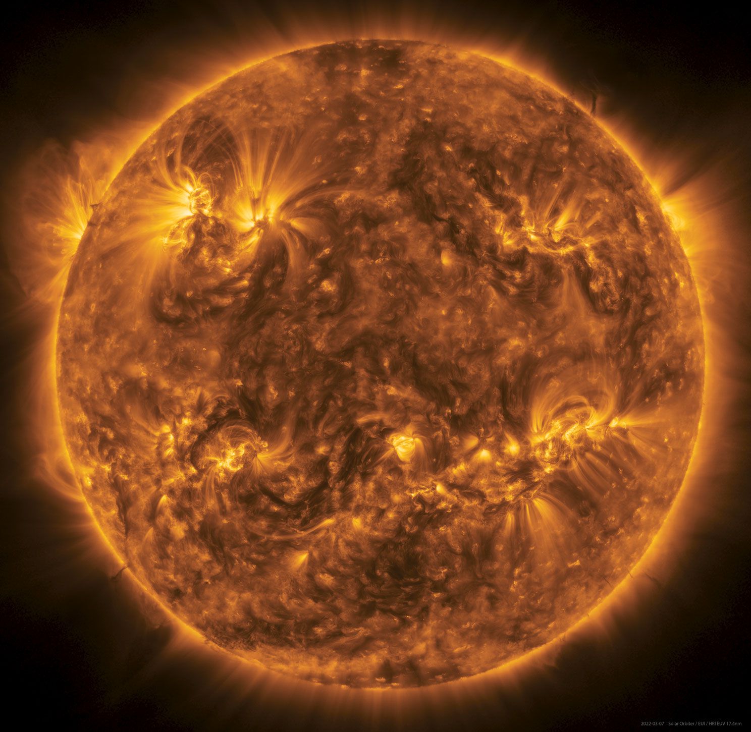 A high-resolution photo of the Sun taken by Solar Orbiter on 7 March 2022 when it was at a distance of about 108 solar radii from the Sun’s surface. (Courtesy of ESA and NASA/Solar Orbiter/Extreme Ultraviolet Imager team; data processing by E. Kraaikamp/Royal Observatory of Belgium.)