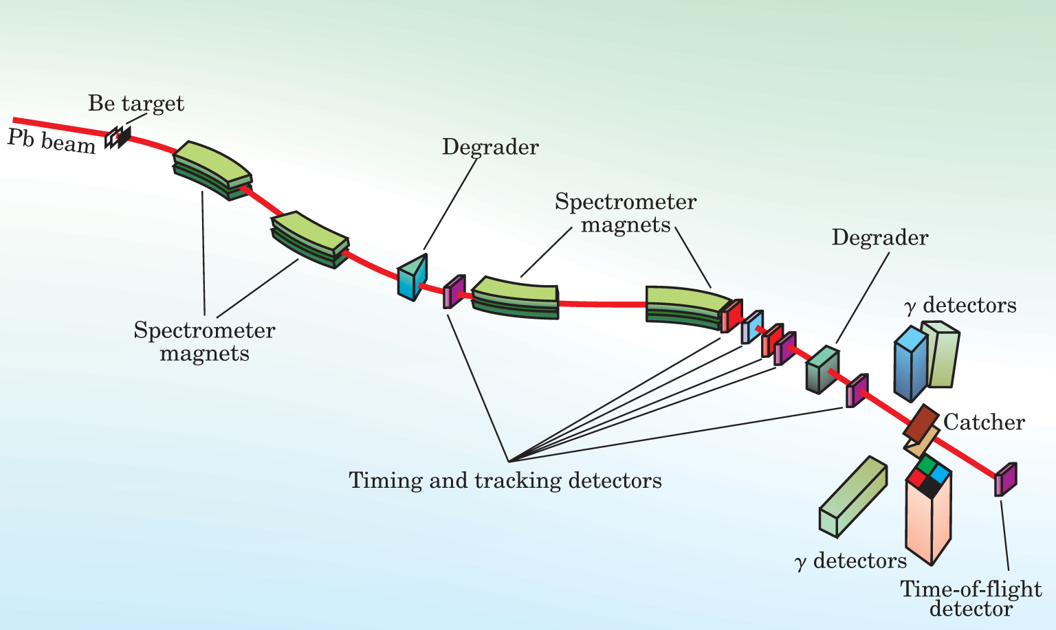 Figure 3. The fragment separator at GSI, the heavy-ion accelerator facility in Darmstadt, Germany, is a prolific source of newly discovered isomers. In a recent experiment,8 lead-208 nuclei, accelerated to 1 GeV per nucleon, fragment on a beryllium target. Fragments are separated and steered by magnets, and tracked and timed by wire-chamber and scintillation detectors. They are finally stopped by a “catcher” in the middle of an array of segmented germanium detectors that record gamma-ray photons from the de-excitation of isomers.