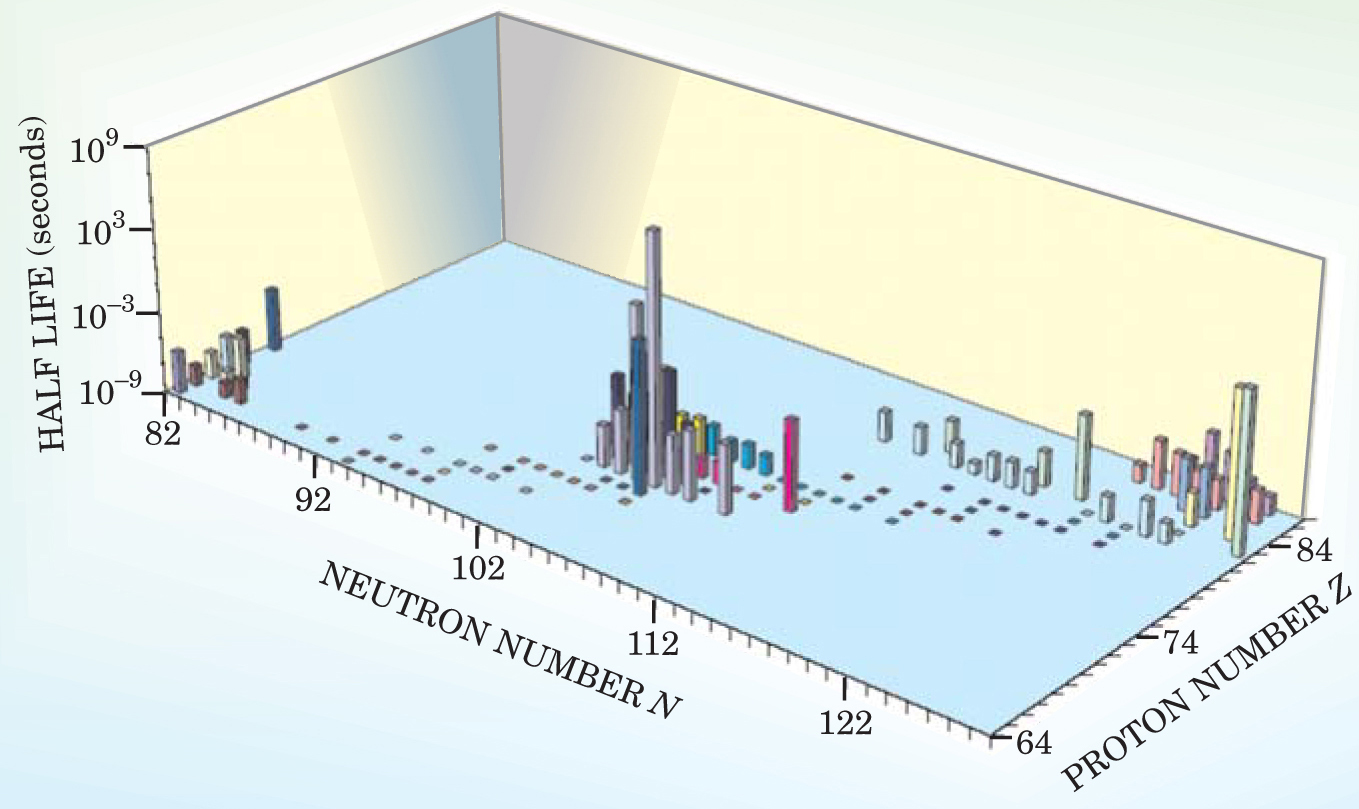 For tantalum in stars, the issue is the β-decaying ground state of 180 Ta. If the star is hot enough (above 109 K), excitation and de-excitation of nuclei by thermal photons will yield an equilibrium mixture of the ground and isomeric states. That’s the kind of environment required for slow-neutron-capture (s-process) nucleosynthesis (see the article by John Cowan and Friedrich-Karl Thielemann in October 2004, page 47).
