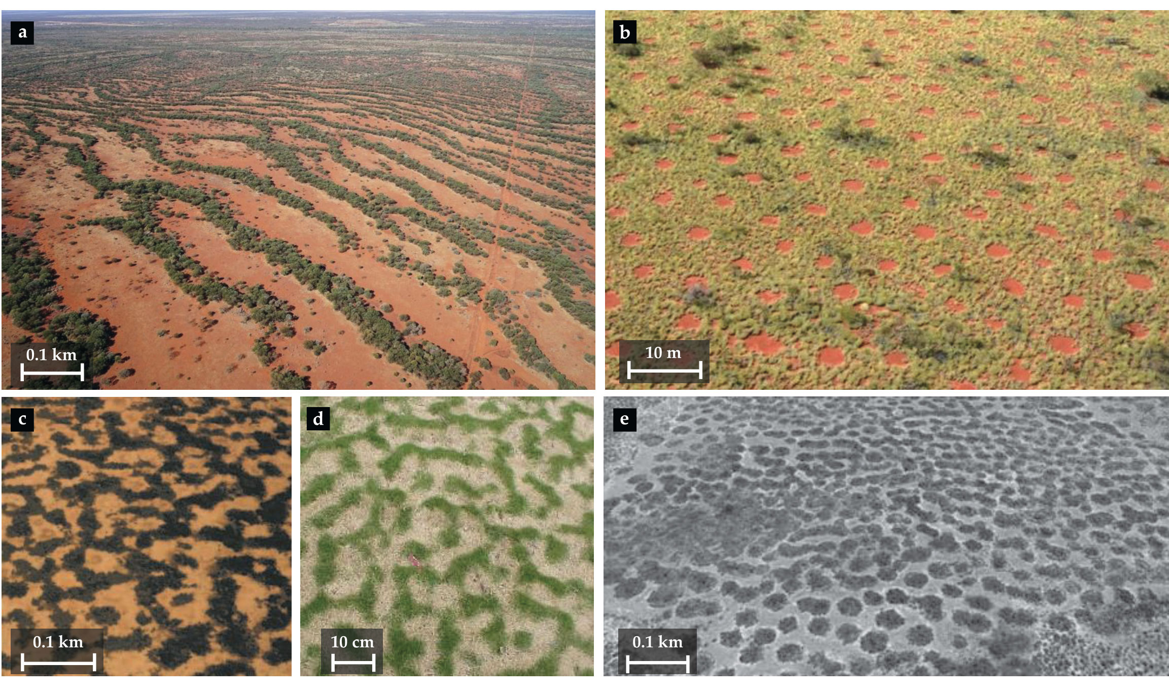 In a time when aerial photographs, let alone satellite images, of remote regions were hardly available, Turing could not have imagined the possible realizations of his predictions for dryland vegetation. Those who have traveled through arid and semiarid regions may have noticed the patchy character of the landscape, which is made up of vegetation patches surrounded by bare-soil areas or vice versa. Usually the patchiness appears irregular, which has traditionally been attributed to variable microtopography and soil heterogeneities. It came as a big surprise when aerial photographs of dryland regions, first in East Africa 5 (even before Turing’s paper) and later in many regions across the world, revealed strikingly regular vegetation patterns with various morphologies that were not recognizable from the ground.