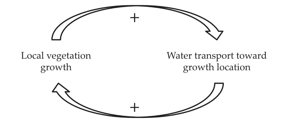 The spontaneous appearance of large-scale spatial order is often a result of a local positive feedback loop that amplifies small perturbations throughout the whole system and thereby induces an instability of the original state. But what positive feedback loop could drive the formation of the observed periodic vegetation patterns? Assuming that pattern formation in water-limited ecosystems can be explained solely in terms of vegetation growth and water availability, researchers have proposed a feedback loop, illustrated in figure