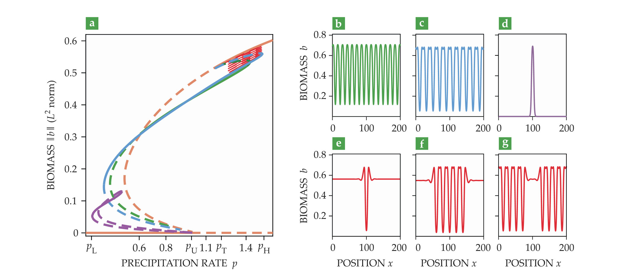 Analytical and numerical studies of the model discussed above have shown that all three biomass–water feedback loops can induce a nonuniform stationary instability of uniform vegetation when the precipitation rate