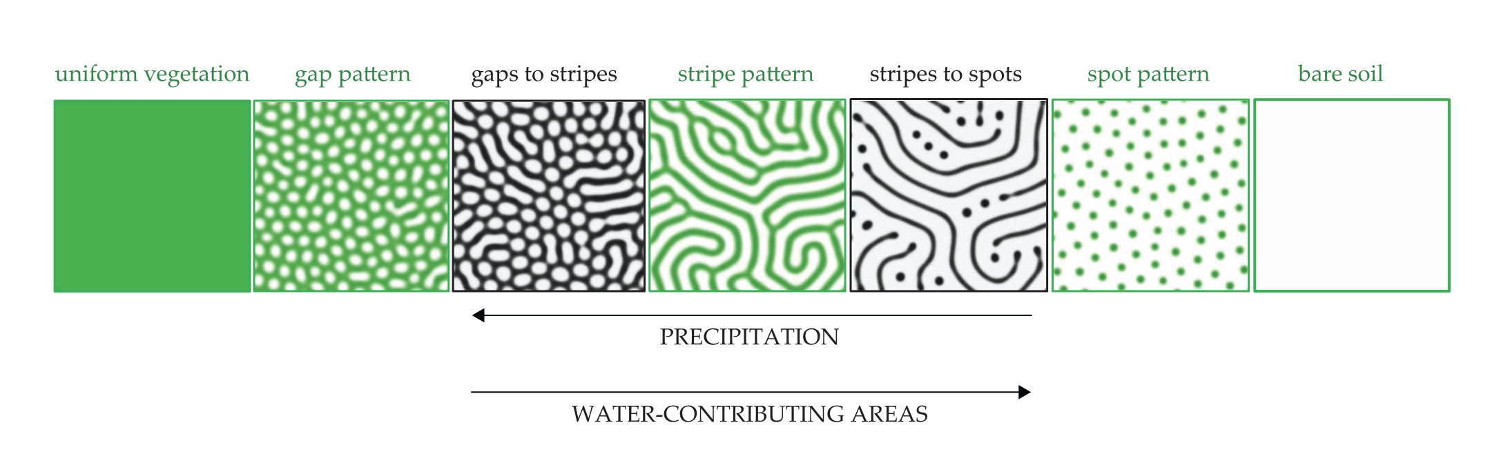 The five basic vegetation patterns along the rainfall gradient (green panels) and snapshots of two morphological transitions (black-and-white panels) as obtained by model simulations with slowly decreasing rates of precipitation. As precipitation decreases from left to right, bare-soil areas, which contribute water to adjacent vegetation areas, should increase in size for the vegetation to remain viable. That increase results in two morphological transitions: Gaps become stripes through the merging of bare-soil gaps, and as vegetation disintegrates further, those stripes turn into spots.