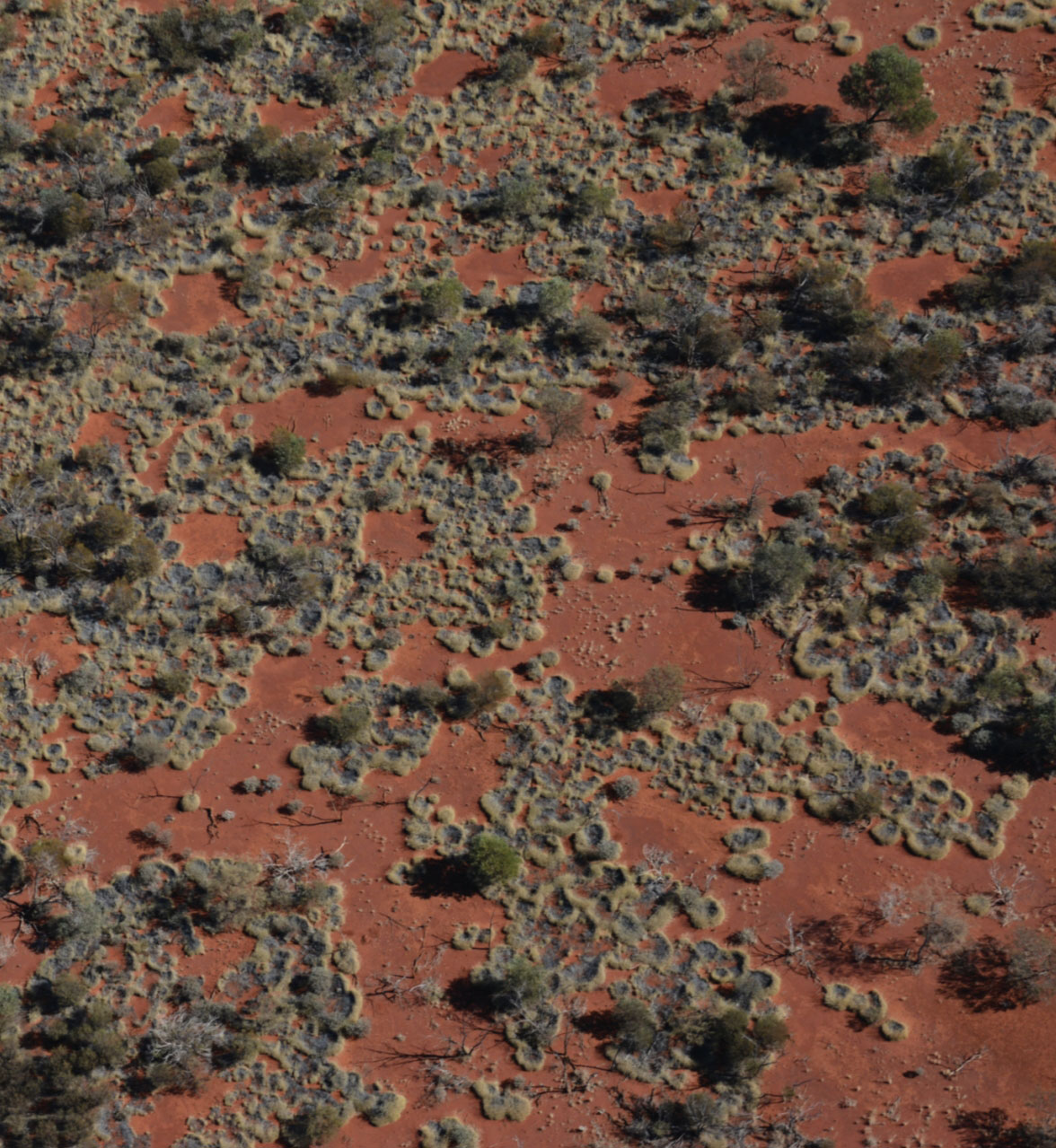 Dryland vegetation can form a range of patterns. (a) Banded woody vegetation on a sloped terrain in Australia (photo courtesy of Stephan Getzin). (b) A gap pattern of herbaceous vegetation in Australia (from ref.