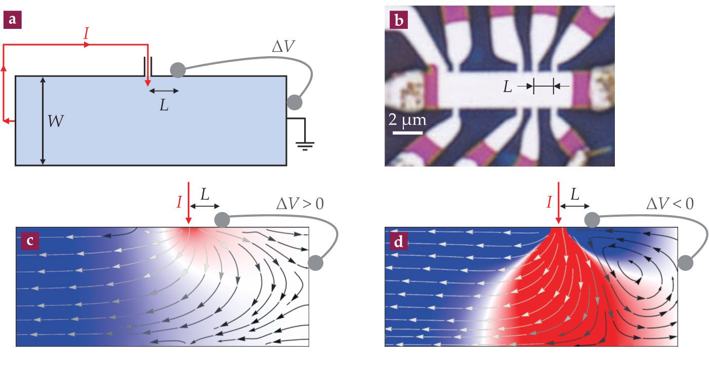Negative resistance and current whirlpools.(a) In a so-called vicinity-resistance measurement, current I is injected into a two-dimensional device of width through a narrow lead, and a potential drop is measured between a voltage probe placed a short distance L from the injector and a faraway lead. (b) In this micrograph of a real device, graphene (white) is tipped with electrical contacts (magenta), and current and voltage probes can sample any of several positions during an experiment. (c) This color map shows the calculated distribution of electrical potential in the absence of viscosity. The voltage and resistance are positive (red) and arrows reveal the steady-state current pattern. (d) In the case of viscous flow, lobes of negative voltage (blue), and thus negative resistance, emerge near the current injector . The finite viscosity induces whirlpools in the current flow. (Adapted from ref. 4.)